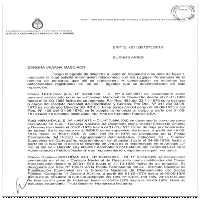 En otros términos, datos almacenados por la administración y conservados con el identificador habrían permitido a la DISCAD14 consolidar archivos patronímicos de los sujetos y de sus vínculos (parentales, filiales, laborales, patrimoniales y demás). En lo que respecta a datos poblacionales, la Secretaría de Hacienda en coordinación con el INDEC operaron el Centro SCD con equipos IBM bajo la dirección del contador Roberto C. Luzzani. Pero todo EBA es resistido15 y al revisar la síntesis biográfica de Carlos Noriega, la presunción se hace evidente pues se inició trabajando en CONADE hacia 1962 y fue detenido-desaparecido en 1977 siendo director del INDEC (1973-1977) aunque en su legajo figura su renuncia.