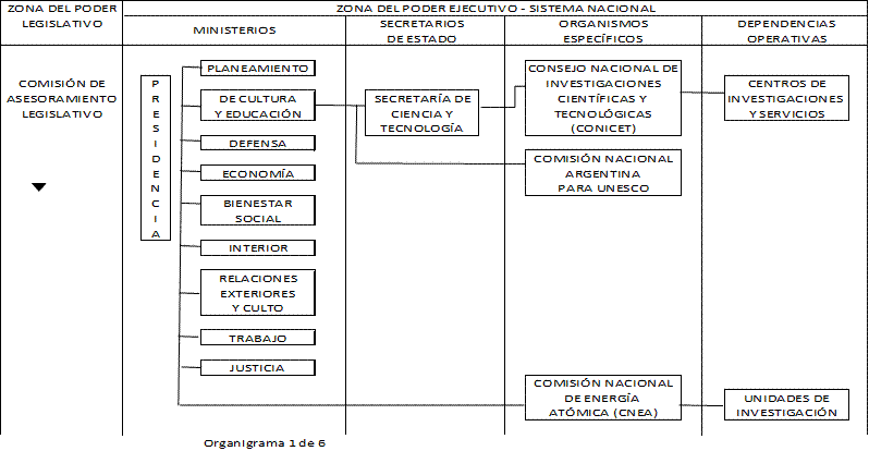 No hay que soslayar que el proceso de desarrollo vinculado al uso de máquinas expresa demandas económicas, sociales y políticas relacionadas a la gubernamentabilidad sobre todo cuando objetivos de seguridad, de defensa o de poderío económico aparecen ligados a las conquistas de la ciencia y la tecnología. Se ha visto que la seguridad era la herramienta defensiva “que obraba a la manera de un escudo protector del desarrollo” (Comando en Jefe del Ejército, 1967) lo que explica la extensa zona del poder ejecutivo que comprendió a los ministerios, secretarías, organismos y dependencias vinculadas al Ministerio de Cultura y Educación, del cual se desprende la Comisión Nacional Argentina para UNESCO y la Secretaría de Ciencia y Tecnología de la cual depende el CONICET (Esquema 4 ).