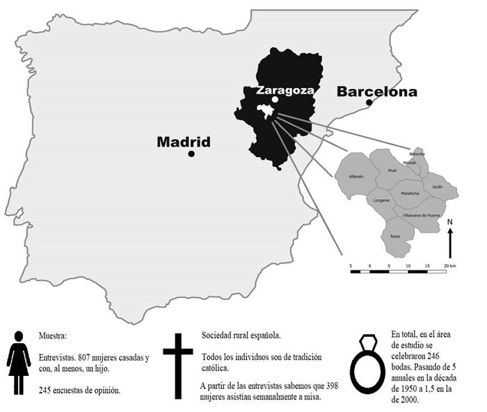 Este artículo analiza nueve localidades rurales aragonesas (nordeste de España): Alfamén, Botorrita, Jaulín, Longares, Mezalocha, Mozota, Muel, Tosos y Villanueva de Huerva (para conocer su ubicación véase Figura 1). El área se encuentra en el valle medio del río Huerva, combinando planicies y paisajes de baja montaña. Es fácilmente accesible desde la capital regional, Zaragoza, tanto por autovía como por tren. De acuerdo a los datos facilitados por el Instituto Nacional de Estadística,1 el área contaba con un total de 8,404 habitantes en 1940, 7,186 en 1960, 5,871 en 1981, 5,372 en 2001 y 5,444 en 2012. Los datos del Instituto Nacional de Estadística también demuestran que las migraciones campo-ciudad afectaron enormemente a algunos municipios, principalmente a los de menor tamaño. Su posición céntrica favoreció la emigración tanto a Zaragoza como a Barcelona y Madrid. Esta ubicación privilegiada también ha permitido el establecimiento de algunas fábricas en sus polígonos industriales que han evitado una mayor despoblación (Marco-Gracia, 2011). Esta área de estudio fue seleccionada por estar compuesta de localidades con un contexto poblacional, económico y social típico de las localidades del interior español, especialmente, del valle del Ebro (despoblación, dedicación agrícola, con una población envejecida, valores tradicionales, y una baja asistencia regular a la eucaristía), y por la disponibilidad de contactos personales vinculados a estas localidades que nos permitieron acceder a sus archivos y entrevistar a una parte de la población.