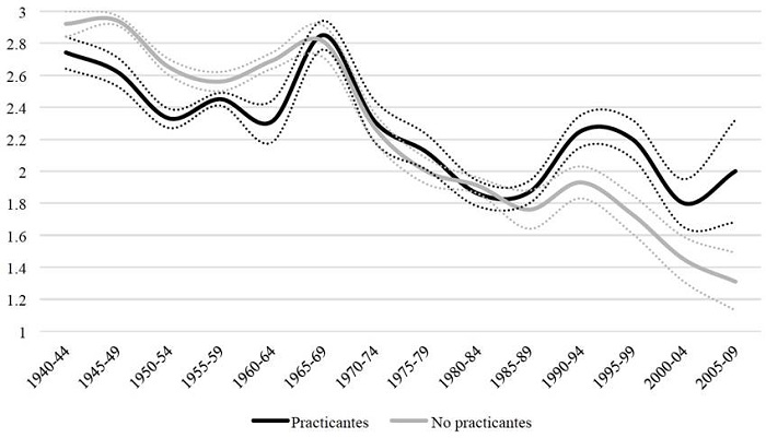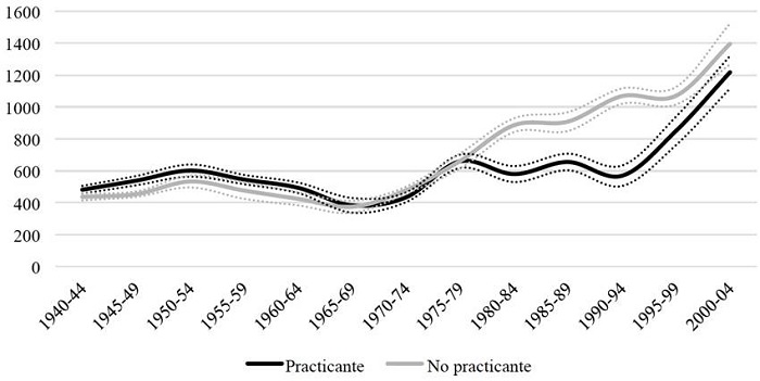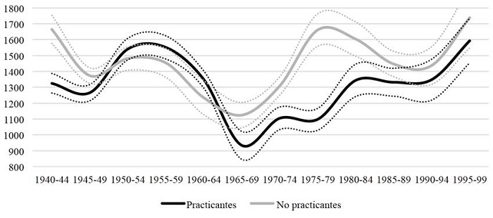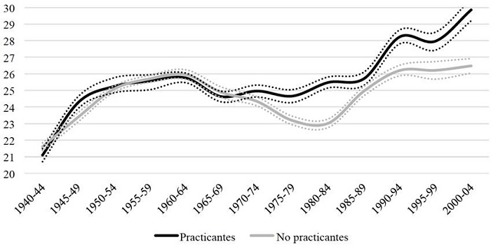 A continuación, nos vamos a centrar en responder a la pregunta: ¿afectó la religión al comportamiento demográfico en esta área de estudio? Para ello, vamos a realizar un análisis comparativo entre las mujeres practicantes y las mujeres no practicantes en función de diversas cuestiones como la edad de acceso al primer matrimonio o el número total de hijos (como aproximación al tamaño familiar ideal). Las comparaciones van a ser realizadas con estadística descriptiva que nos permitirá estudiar la evolución en el tiempo de las variables. En las Figuras, junto a los valores medios se incluyen intervalos de confianza a 95 por ciento para confirmar estadísticamente el interés de los resultados.