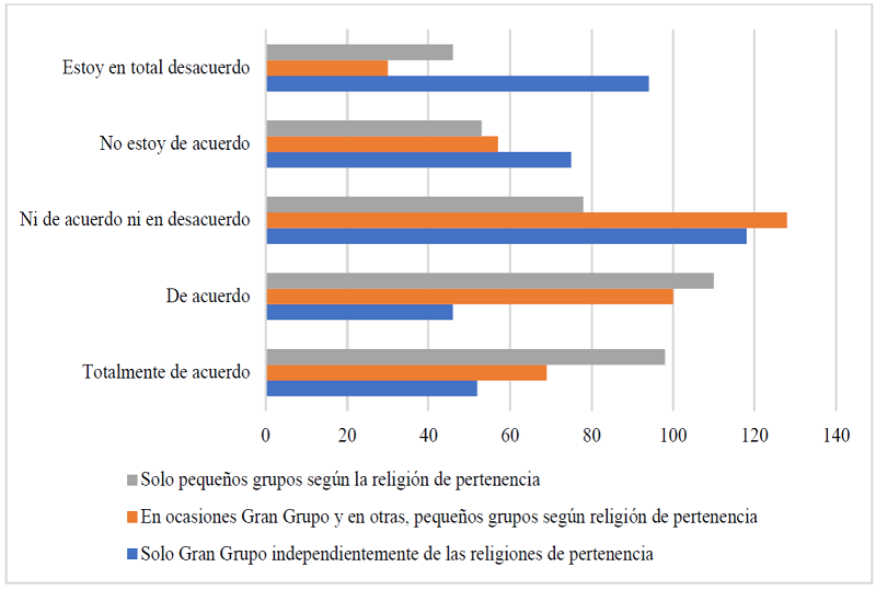 Seguidamente, para conocer el tipo de agrupamiento con el que el alumnado se muestra más interesado, se han tenido en cuenta las siguientes tres variables, extraídas del grupo de ítems analizado: interés por la enseñanza a todos los alumnos juntos independientemente de su religión (solo gran grupo), interés por la enseñanza en parte a todos juntos y en parte separados por grupos (gran grupo y grupos pequeños) e interés por la enseñanza por separado en grupos según la religión de pertenencia (solo grupos pequeños).