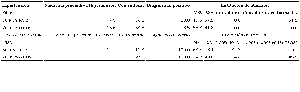 En la Tabla 10 se observa que la cantidad de adultos mayores que utiliza los servicios de detección para la hipertensión arterial es baja, representa apenas 7.8 por ciento de la población menor de 70 años y 15.6 por ciento de la población de 70 años o más. Más de la mitad llegó a la consulta con algún síntoma, pero en pocos casos el resultado del diagnóstico confirmó la enfermedad representan entre 8.5 y diez por ciento. Por lo que toca a la detección de niveles altos de colesterol apenas entre 7.7 y 12.4 por ciento de los adultos mayores acuden a las consultas de prevención, 27.1 por ciento de los adultos de 70 años presentaban algún síntoma y 11.4 por ciento de los adultos de 60 a 69 años. En 100 por ciento de los casos el examen de sangre confirmó el diagnóstico.