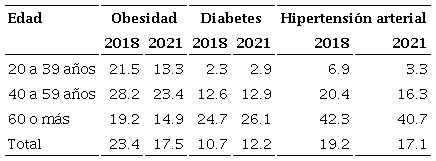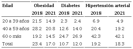 En la Tabla 11 se presenta la prevalencia por edad de la diabetes, de la hipertensión arterial y de la obesidad por edad en el país, como se puede ver la diabetes se mantiene en niveles bajos los adultos jóvenes alrededor del 2, para incrementarse entre los 50 y los 59 años de tal manera que se incrementa la prevalencia de 12 a 14 por ciento. En la vejez el incremento en la prevalencia se incrementa significativamente, si bien en 2018 una cuarta parte de los adultos mayores padecen diabetes para 2021 la prevalencia sube a 27 por ciento.