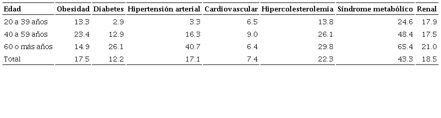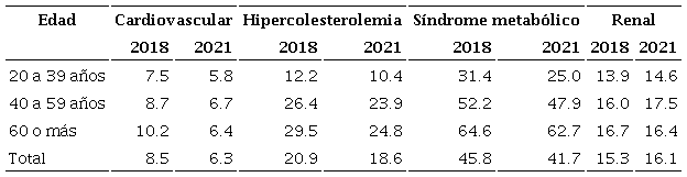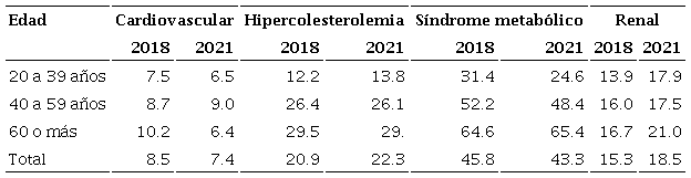 En el caso de la hipertensión arterial la prevalencia se incrementa entre las cohortes de 40 a 59 años y de 60 años o más de 19.2 a 41.1 por ciento. Los enfermos renales se mantuvieron en un rango de 15 a 17 por ciento.