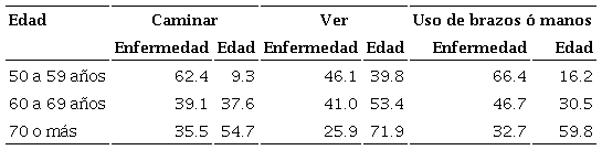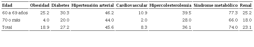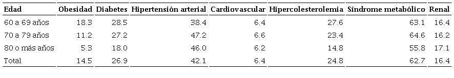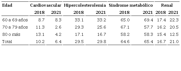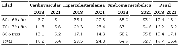 En las edades de los 70 o más años, la hipertensión arterial alcanza su nivel más elevado 38 por ciento, la prevalencia de la diabetes llega a 22.5 por ciento y la hipercolesterolemia disminuye a 15.7 por ciento. La incidencia de las enfermedades cardiovasculares se mantiene constante de 5.8 por ciento, la prevalencia de la enfermedad renal sube casi dos puntos porcentuales de al final de la vejez y en la ancianidad (Tabla 5).