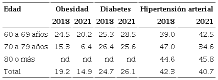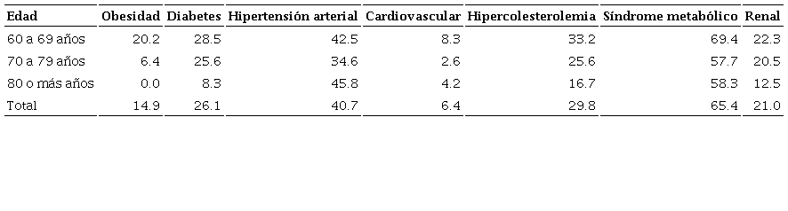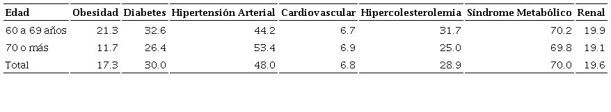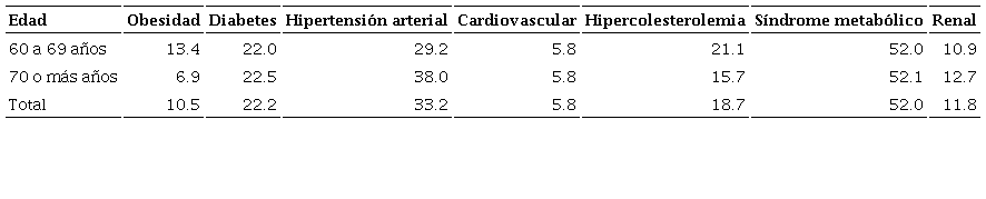 Al inicio de la entrada a edades mayores entre los 60 y los 69 años, la prevalencia de la hipertensión arterial es de 29.2 por ciento después le sigue la hipercolesterolemia con 21.1 por ciento y como ya se mencionó con anterioridad la diabetes con 22 por ciento.