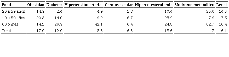 El 48 por ciento de las mujeres mayores de edad son hipertensas, 30 por ciento parte es diabética y 30 por ciento tiene hipercolesterolemia. Sería probable encontrar muchos casos de pacientes diabéticas con niveles elevados de colesterol. En la senectud y en la vejez la prevalencia de la diabetes es elevada (32.6 por ciento), las hipertensas representan 44.2 por ciento. El 31.7 por ciento padece de hipercolesterolemia, 21.3 por ciento de obesidad, las enfermedades cardiovasculares 6.7 por ciento. Derivado de elevadas prevalencias 70.2 por ciento presenta alguna o varias enfermedades de lo que se conoce como síndrome metabólico. Lo que se refleja en el nivel elevado de la prevalencia de enfermedades renales (Tabla 7).