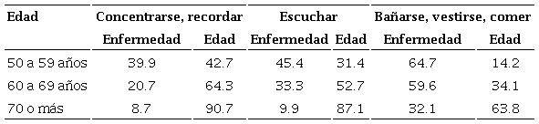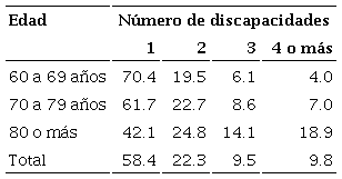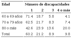 El número de discapacidades aumenta con la edad (Tabla 23), 70.4 por ciento de la población adulta con una discapacidad tiene entre 60 y 69 años, entre los 70 a 79 años disminuye a 61.7 por ciento pero aumenta el porcentaje que tienen dos discapacidades 22.7 por ciento y también aumenta el porcentaje con tres y cuatro discapacidades 8.5 y siete por ciento. En la ancianidad se destacan los adultos mayores con dos y con cuatro y más discapacidades representan 24.8 y 18.9 por ciento.