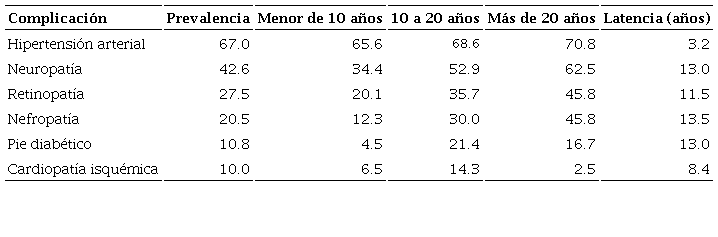La aparición de las complicaciones de la diabetes está directamente relacionada con la cronicidad es decir con el tiempo de exposición a la enfermedad. Solamente en 13.6 por ciento de los casos expedientes se reportó la duración de la enfermedad y de estos 14.6 por ciento la duración era mayor ó igual a 15 años, siendo los casos con una duración mayor a 15 años los más propensos a presentar alguna complicación. Al analizar la presencia de los casos con más de una complicación se encontró que la presencia de alguna aumenta el riesgo de que aparezcan más.