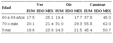 En la Tabla 21 se presenta el porcentaje de población de la tercera edad con discapacidades para ver, oír y caminar, se observa que la población mexiquense con problemas de visión representa 23.9 por ciento por arriba de promedio nacional de 18.9 por ciento. El 21.5 por ciento de la población mexiquense tiene dificultades para escuchar, a nivel nacional 24.3 por ciento presenta esta problemática. Por que respecta a la discapacidad para caminar, la mitad de los adultos mayores en el Estado de México se enfrenan a problemas de movilidad.