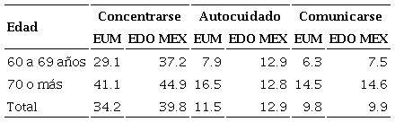 En la Tabla 22 se presenta el porcentaje de personas que tienen alguna dificultad para concentrarse, recordar o para aprender, para comunicarse y para realizar actividades que tienen que ver con su autocuidado bañarse, vestirse y comer. Los adultos mayores con problemas para concentrarse representan 39.8 por ciento, a nivel nacional la población que presentan estas dificultades representa 34.2 por ciento. Resalta que la población los problemas para concentrarse crece con la edad, de 60 a 69 años representa 37.2 por ciento, para los 70 años aumenta de modo que su peso relativo alcanza 44.9 por ciento.