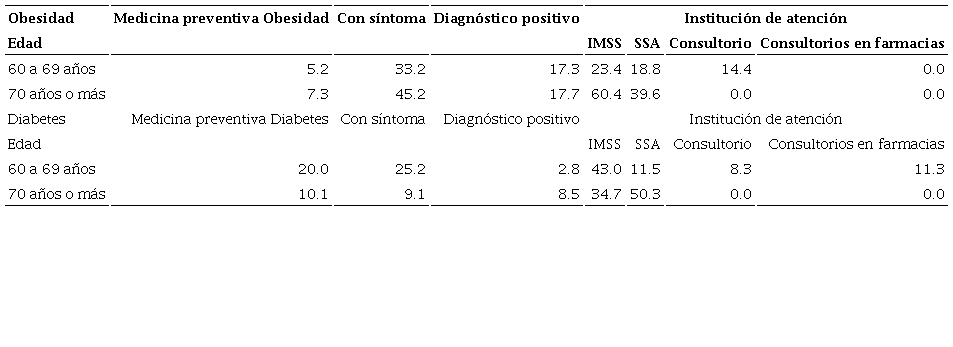 En el caso de la diabetes que está considerada como un problema de salud pública el porcentaje de la población adulta mayor que declaró asistir a una consulta de detección de la diabetes es del oscila entre 20 y 10.1 por ciento. El porcentaje de adultos mayores que asistieron a los servicios preventivos por presentar algún síntoma en la vejez es de 25.2 por ciento. Es de llamar la atención que el porcentaje de diagnóstico positivo es menor al porcentaje que asistieron por presentar algún síntoma de diabetes (Tabla 9).