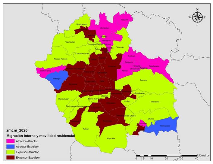 III. En la zona metropolitana conviven unidades territoriales con atracción y con expulsión de población migrante interna, así como zonas de salida y de arribo de movilidad residencial. En el Mapa 1 se muestra el comportamiento de estos dos flujos para 2020 en las unidades territoriales pertenecientes a la Zona Metropolitana de la Ciudad de México.