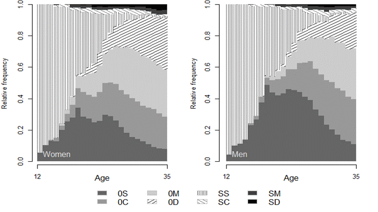 By combining these two dimensions, I defined eight possible states that may occur in the sequence, as depicted in Table 2. The state OS means that the individual is not attending school and has never been married or cohabitated at a given age. OC means that the individual is not attending school and is cohabiting. OM implies that the individual is not attending school and is married, and OD means that the individual is not attending school and had a previous union that is dissolved. Similarly, the remaining states refer to the condition in which, at a given age, the individual is attending school and is single (SS), in cohabitation (SC), married (SM), or when the first union has been dissolved (SD).