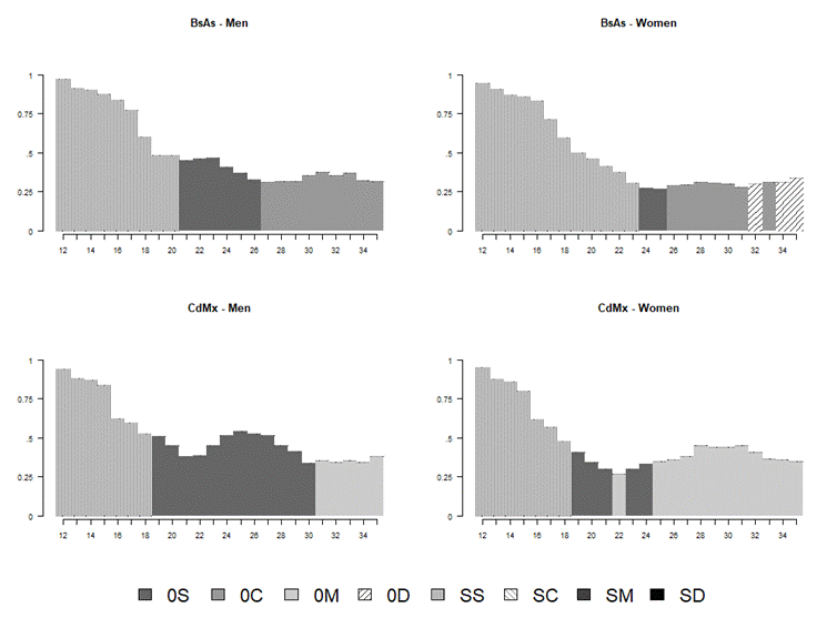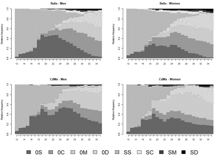 On the other hand, men in Mexico City presented a longer period with a modal state of never partnered than their peers in Buenos Aires, and marriage was more frequent in the thirties. In Buenos Aires, cohabitation prevailed from the late twenties. Once again, there was no position in both cities for men and women, where a combination of school attendance and marriage or cohabitation prevailed. So far, there is evidence to support the first hypothesis. However, there is not enough evidence to support the second one.
