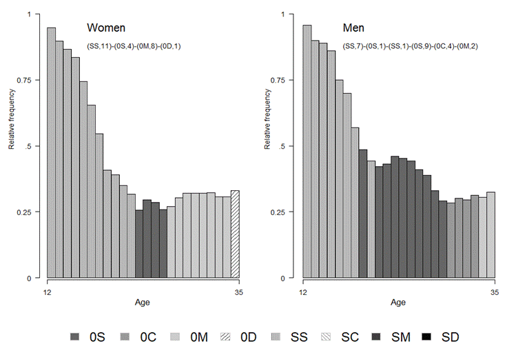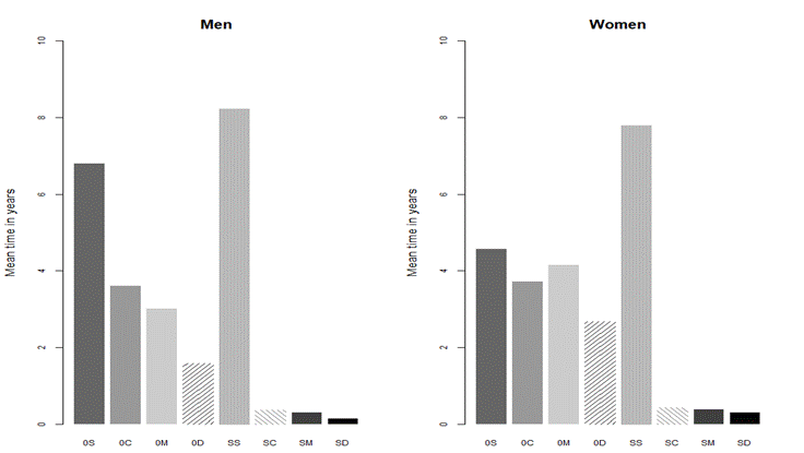Figure 5 represents the mean time spent in each state. In the sample, both men and women spent more time never partnered and attending school. This state (SS), however, was more present in men (8.22 years) than women (7.79 years). The second state with more presence in the sequences was when individuals remained single and did not attend school. Once again, this state (0S) was more present in men (6.79 years) than in women (4.57 years). The time spent in the states 0C, 0M, and 0D was higher in women. As evidenced before, the time spent in states where there was a combination of roles, i.e., SC, SM, and SD, was low for men and women.