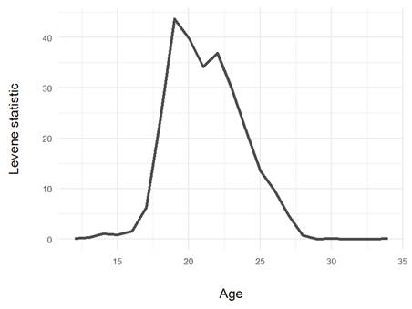 Following Studer et al. (2011), Figure 6 presents the evolution of the Levene statistic to identify the extent of the differences in the sequences by age. The curve shows low differences in the discrepancy during adolescence but increases with age, reaching its peak at 19 years old, which indicates the most prominent differences by sex.