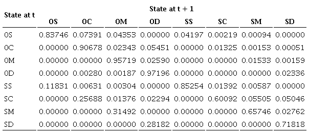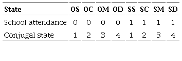 By combining these two dimensions, I defined eight possible states that may occur in the sequence, as depicted in Table 2. The state OS means that the individual is not attending school and has never been married or cohabitated at a given age. OC means that the individual is not attending school and is cohabiting. OM implies that the individual is not attending school and is married, and OD means that the individual is not attending school and had a previous union that is dissolved. Similarly, the remaining states refer to the condition in which, at a given age, the individual is attending school and is single (SS), in cohabitation (SC), married (SM), or when the first union has been dissolved (SD).