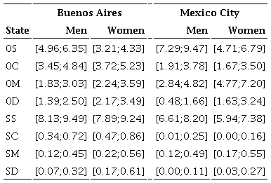 The 95 per cent confidence interval of the mean time spent in each state by sex in each city is detailed in Table 3 to evaluate the extent of the differences. The average time spent as single and attending school (SS) was not significantly different between men and women in both cities, unlike the time spent as single and not attending school (0S), which was higher in men. There were no differences by sex in the average time spent not attending school and cohabiting (0C). There were no differences in the states 0M and OD in Buenos Aires. In Mexico City, the differences were more evident, with the time higher in women. As mentioned before, the average time of any state that involves school attendance, except for the never-partnered state, was very low, and there were no significant differences by sex, which did not provide enough evidence to support women experienced more school attendance before and after the onset of the conjugal trajectory than men. It is worth noting some differences by city. Women in Buenos Aires spent more time in the states SS, SC, and 0C, whereas women in Mexico City spent more time in the states 0S and 0M. Men in Buenos Aires spent more time in the states SS and SC, and men in Mexico City spent more time in the state 0S.