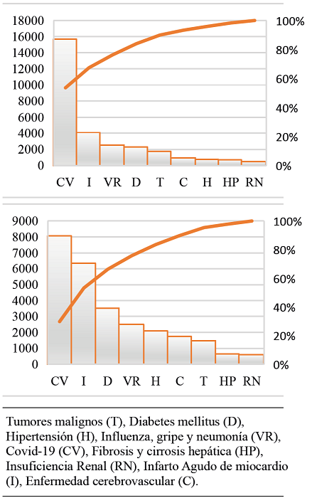 La Figura 1 presente dos ejes y, el primero con las frecuencias absolutas y el otro con las frecuencias relativas acumuladas. Las barras se rigen con la frecuencia absoluta y la línea naranja es una ojiva que grafica la frecuencia relativa acumulada. Por ejemplo, para el primer gráfico de esta figura (hombres), la causa CV presentó aproximadamente 16 mil defunciones para los hombres, es decir cerca de 60 por ciento de muertes por esta causa, además, aproximadamente 80 por ciento de las muertes fueron por las causas codificadas como CV, I VR, mientras que en las mujeres (segundo gráfico) se aprecia que cerca de 80 por ciento de las muertes analizadas fueron por las causas CV, I, D y VR.