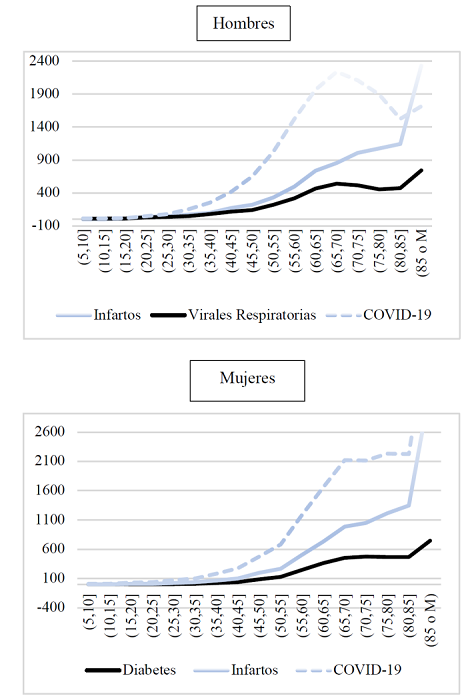 La Figura 2 muestra las muertes por edades de las tres principales causas para hombres y mujeres.