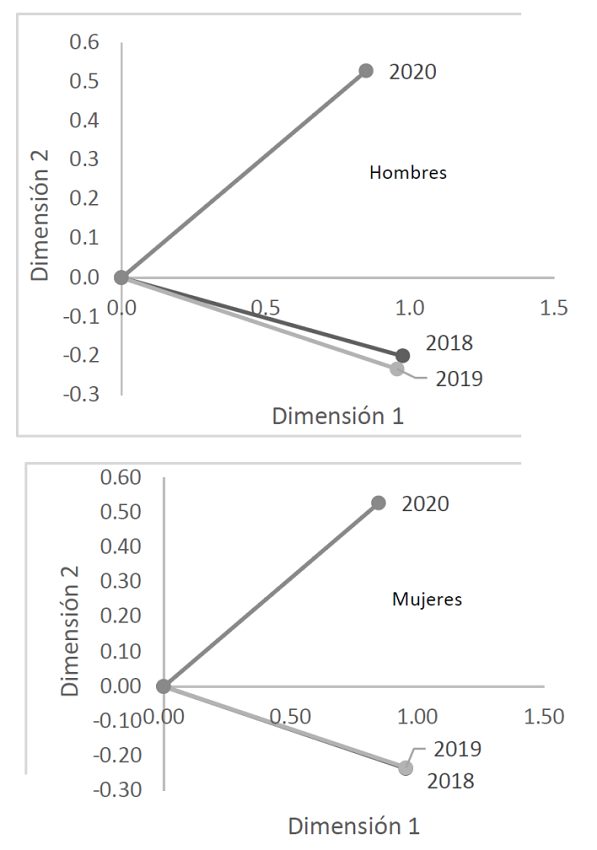 La matriz compromiso se obtiene combinando linealmente las tablas de datos de los años 2018, 2019, 2020, como se mencionó anteriormente se lo obtiene mediante el primer eigenvector de la matriz RV. Para el caso de hombres, los coeficientes fueron 0.954, 0.955 y 0.852, mientras que para las mujeres fueron 0.974, 0.972 y 0.896 para los años 2018, 2019 y 2020, respectivamente. Es decir, en ambos casos se dio mayores ponderaciones a los años 2018 y 2019.