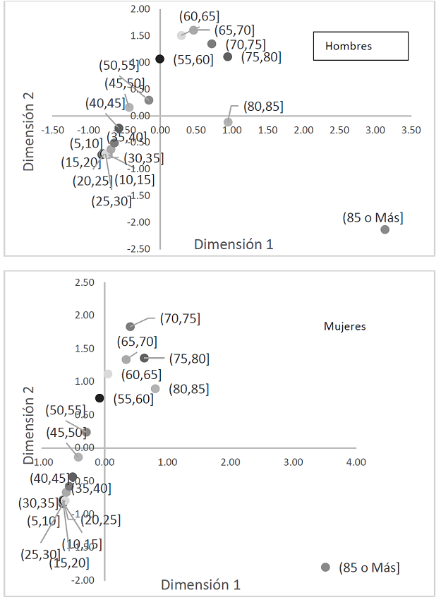 Por otra parte, las edades mayores a 55 en hombres y a 60 en mujeres ya muestran puntuaciones positivas en ambas dimensiones, pudiendo morir por cualquier causa, en especial se presentan puntuaciones altas en la primera dimensión en las edades mayores a 85 años.