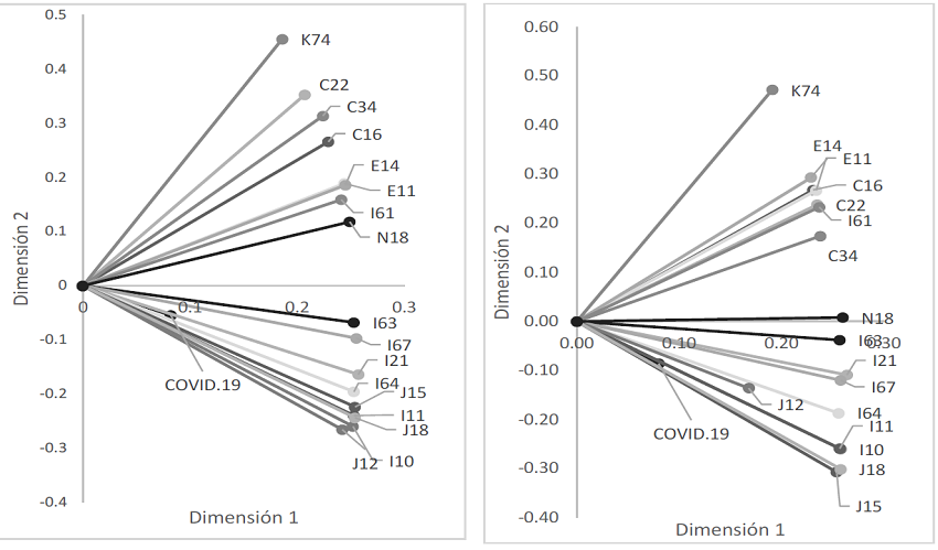 En la Figura 5 se puede visualizar que todas las causas analizadas en este estudio tienen cargas vectoriales positivas en la dimensión uno. En relación a la dimensión dos tienen cargas positivas las relacionadas a HP, T, D, RN y la causa I61, hemorragia intraencefálica que está dentro del grupo (C) de enfermedades cerebrovascular y cargas negativas las relacionadas a los grupos VR, CV, I, H, las restantes del grupo C. Las líneas más cercanas indican una mayor correlación entre sí. Por ejemplo, en hombres aparecen muy relacionadas entre sí Diabetes mellitus (E11, E14) y Tumores malignos (C16, C22, C34) y en mujeres, Diabetes mellitus, insuficiencia renal (N18). También se resalta la alta correlación entre la COVID-19 y los grupos de influenza, neumonía y gripe, infarto, hipertensión, lo que coincide con resultados de algunos estudios (Wu & McGoogan, 2020, García-Bustos et al., 2021).