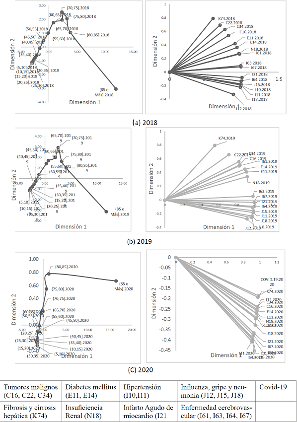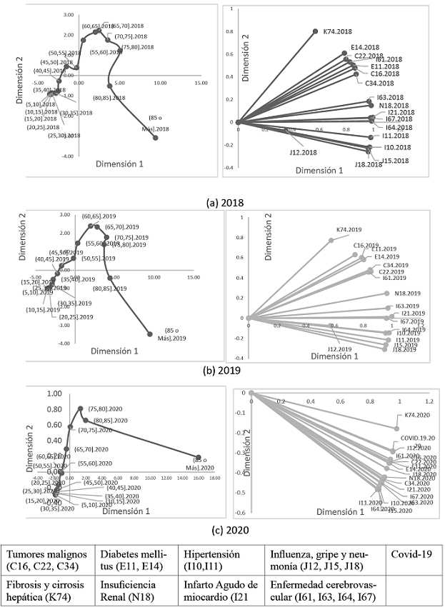 La matriz compromiso nos permitió observar las asociaciones que se mantuvieron estables a través del tiempo en cuanto a causas de muerte según los rangos de edad; indicando que las principales causas de muerte fueron Covid-19, infartos (I), influenza, gripe y neumonía (VR); y que en las edades de 45 a 55 años en hombres y de 50 a 60 años en mujeres las causas principales fueron tumores malignos (T) y diabetes mellitus (D).