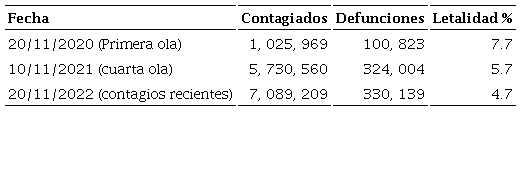 Al realizar el análisis del porcentaje de letalidad en México, según datos disponibles hasta el 4 de octubre de 2022, visualiza la evolución histórica de los contagios y las defunciones (ver Tabla 1). De 2020 a 2022. En este periodo, el primer acercamiento confirma el descenso sostenido y significativo del porcentaje de letalidad y de contagios. Este dato es relevante porque muestra la tendencia a la baja y el peso que tuvo la enfermedad en la mortalidad durante las primeras olas, aunque hasta el momento no se pueda sostener que la enfermedad se ha erradicado.