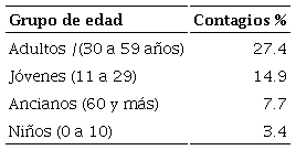 Al clasificar el porcentaje de contagios en los grupos de edad (ver Tabla 2); el grupo relevante que destaca es el de los adultos, también llamado población en edad activa (de 30-59 años), los cuales superan al resto de los grupos de edad (27.4 por ciento).Esta información se explica porque fueron vacunados tardíamente y porque tenían la necesidad de salir de casa al trabajo, al no tener el privilegio del empleo en línea. Este dato es de enorme relevancia dadas las características sociales del grupo, quienes son los de mayor exposición al riesgo de contagios, mayor vulnerabilidad y experimentaron baja capacidad de respuesta ante los contagios. En el orden de importancia de este evento, le sigue el grupo de los jóvenes de 11 a 29 años (14.9 por ciento). Hasta esta parte, la explicación de la causa en las olas de contagios viene de la necesidad de movilidad, lo que ubica a ambos grupos de edad en el mayor nivel de contagios y mortalidad. Después, predominan los ancianos que representaron 7.7 por ciento de contagios y al final está el grupo de los menores de edad con solo 3.4 por ciento (Tabla 2).