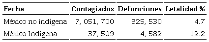 En México, durante la pandemia por Covid-19 ocurrió mayor probabilidad de fallecer en las poblaciones indígenas en comparación con los no indígenas. En particular, en las demarcaciones con proporción considerable de población indígena se registran las mayores tasas de letalidad. Se confirma una vez más la persistencia de alta mortalidad en la población socialmente mas vulnerable, la de bajo acceso a los servicios básicos y de deficiencias en la atención sanitaria oportuna en tiempos de pandemia.