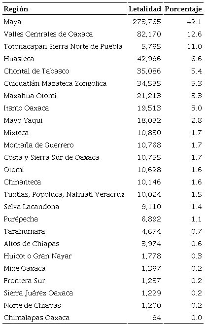 En el país, la desigualdad social encuentra su expresión en el impacto del Covid-19 y esto incrementa la vulnerabilidad de los indígenas. Lo cual se puede corroborar con base en la regionalización propuesta de la CDI (2006). En este caso, los datos aquí expuestos muestran el orden de importancia o las diferencias de la letalidad indígena por Covid-19 de acuerdo con las regiones de México, destacando las tasas de letalidad en el siguiente orden: Mayas de Yucatán, Valles Centrales de Oaxaca, Totonacapan de la Sierra Norte de Puebla, Hustecos, Chontal de Tabasco, Cuicuatlán Mazateca Zongolica, Mazahua, Itsmo de Oaxaca, Mayo Yaqui, Mixteca, Montaña de Guerrero, Costa y Sierra Sur de Oaxaca, Otomí, Chinanteca, Tuxtlas, Popoluca, Nahuatl de Veracruz, Selva Lacandona, Purépecha, Tarahumara, Altos de Chiapas, Huicot o Gran Nayar, Mixe de Oaxaca, Frontera Sur, Sierra Juárez de Oaxaca, Norte de Chiapas y Chimalapas de Oaxaca, y, en menor proporción, hay menor letalidad en el resto de las regiones indígenas. Pero, a fin de cuentas, la proporción de pérdida de la población indígena sólo significa un nuevo mecanismo para su desaparición o extinción (Tabla 4).