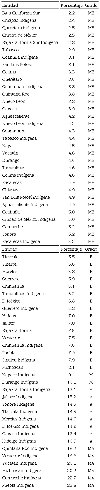 En cambio, las entidades federativas con el mayores brechas entre indígenas y no indígenas destacaron a Puebla, Campeche, Michoacán, Yucatán, Veracruz, Quintana Roo, Hidalgo, Oaxaca, Estado de México, Morelos, Tlaxcala, Sonora, Jalisco y Baja California.
