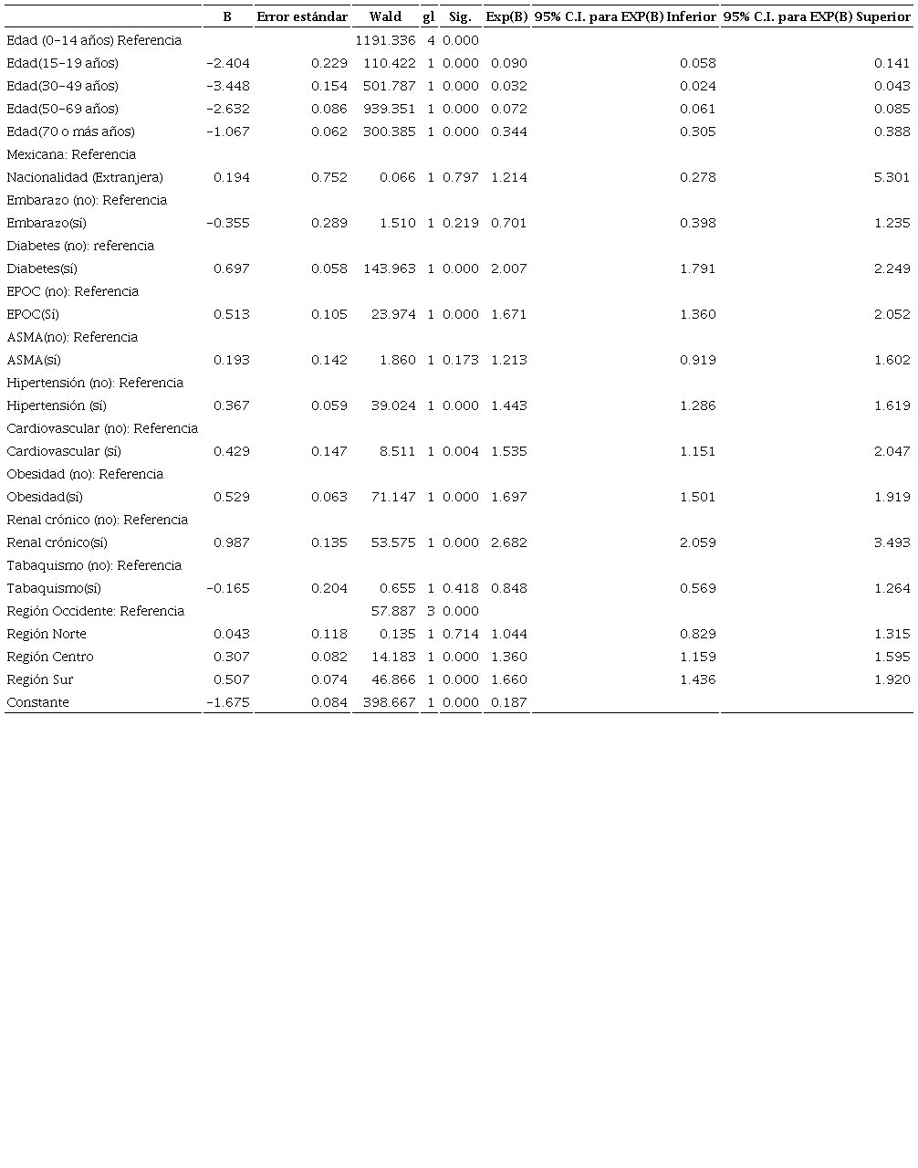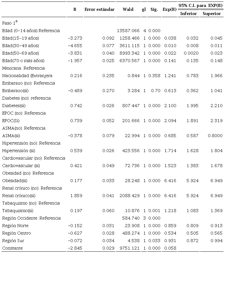 La variable dependiente dummy (Sobrevive/falleció) = variables explicatorias a la edad+ la nacionalidad (mexicana/extranjera)+ embarazo (no/sí)+ diabetes (no/sí)+ EPOC (no/sí)+ ASMA (no/sí)+ hipertensión (no/sí) + enfermedad cardiovascular (no/sí)+ obesidad (no/sí) + enfermedad renal crónico (no/sí)+ tabaquismo (no/sí) y región ( Occidente, Norte, Centro y Sur).