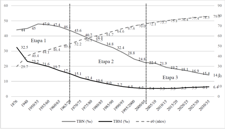 De manera más específica, cabe precisar que para las estimaciones de la tasa bruta de mortalidad (TBM), la tasa bruta de natalidad (TBN), la esperanza de vida al nacer (eo) y la tasa de mortalidad infantil (TMI), se ha podido trabajar con resultados del Censo General de 1876 y del Censo Nacional de Población y Ocupación de 1940, presentados por Varillas Montenegro et al. (1990), y a partir de 1950 con la información estadística brindada por CEPALSTAT, la cual está presentada por periodos quinquenales de 1950/55 a 2025/35 (con estimaciones hasta 2010/15 y proyecciones entre 2015/20 y 2030/35). Para observar estos mismos indicadores desagregados entre áreas urbanas y rurales a partir de 1970 y hasta 2025, se ha recurrido al Boletín de Análisis Demográfico No 35 del INEI (2001), al igual que para presentar las tasas netas de migración entre las áreas urbanas y rurales de Perú durante el mismo intervalo y poner en perspectiva la periodización propuesta de la transición demográfica con los movimientos migratorios entre ambas áreas de residencia. En cuanto a los resultados referidos a las tasas de migración internacional por periodos quinquenales entre 1970 y 2025, se usaron los datos de CEPALSTAT.