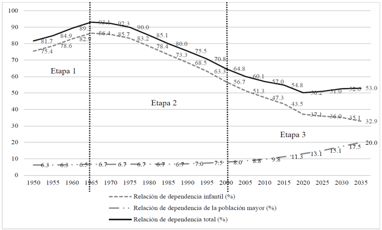 La evolución de las TMN y TBM observadas en cada etapa de la transición demográfica tiene implicancias directas en la estructura por grupos de edades de la población. En la primera etapa que se extiende hasta el periodo 1965/70, los datos disponibles (desde 1950) muestran que el efecto conjugado de la disminución de la mortalidad y del mantenimiento de la natalidad en un nivel muy elevado (superior a 45 por mil) provocó un aumento significativo de la relación de dependencia infantil, la cual llegó a un máximo nivel precisamente en 1965 (86.4 por ciento, es decir con 86.4 niños y niñas de 0 a 14 años por cada 100 personas de 15 a 64 años). A pesar de la disminución de la mortalidad durante las décadas anteriores, la esperanza de vida promedio alcanzada en esta fecha (menos de 50 años) es insuficiente para modificar la relación de dependencia de la población mayor que se mantiene en un nivel mínimo menor de siete por ciento (es decir, en promedio con siete personas de 65 años o más por cada 100 personas de 15 a 64 años) durante la primera y segunda etapa de la transición demográfica. La regularidad de este indicador en un nivel bajo implica que la dependencia total derive a más de 90 por ciento de la población infantil de 1950 a 1995. Durante la segunda etapa delimitada de la transición demográfica (1965 - 2000), la relación de dependencia infantil muestra una importante disminución de 29.9 por ciento, paralela a la baja de la TBN. El descenso significativo del ritmo de natalidad durante este intervalo engendra una menor proporción de dependencia de la población infantil (0-14 años) con respecto a la población adulta (15-64 años). La tercera etapa de la transición demográfica muestra una prolongación de la disminución de la relación de dependencia infantil a un nivel inferior a 40 por ciento a partir de 2020. Esta misma etapa se caracteriza por un aumento progresivo y sostenido de la relación de dependencia de la población mayor, que va subiendo en promedio de 14 por ciento cada cinco años en el periodo 2000-2035. Esta tendencia combinada, según las proyecciones, con una continuación de la disminución de la relación de dependencia infantil a partir de la década de 2020, revela un acercamiento entre ambos indicadores y una evolución demográfica inédita en la cual la relación de dependencia total derivara de manera cada vez más equilibra entre la población menor de 15 años y la población mayor de 65 años. La mayor proporción de la población de mayor de edad a partir de aquella década trae consigo un ligero aumento de la relación de dependencia total por encima de 50 por ciento. La confirmación de estas tendencias en las próximas décadas podría dar lugar a una etapa nueva de la transición demografía en la cual se vayan equilibrando la población infantil y la población mayor (Figura 2).