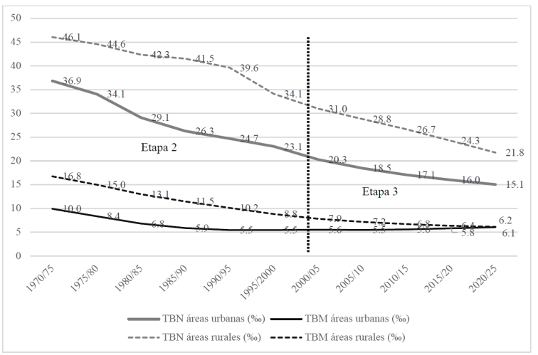 La comparación de las TBM y TBN entre las áreas urbanas y rurales de Perú es posible sólo a partir de 1970/75, periodo desde el cual disponemos de estimaciones y proyecciones fiables calculadas por el INEI (2001). Esta limitación temporal permite una descripción de estos indicadores solo en las etapas dos y tres de la periodización propuesta de la transición demográfica en Perú. Es importante precisar que en 1970 la población rural representaba 42.7 por ciento de la población total del país (64.8 por ciento en 1950) y que esta proporción se ha ido reduciendo para llegar a 18.1 por ciento en 2025 (CEPALSTAT).
