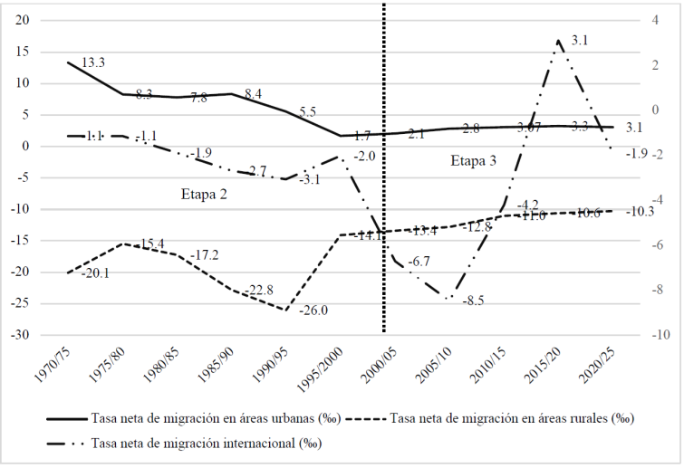 Se observa primero que el nivel de mortalidad sigue una tendencia relativamente similar en las áreas urbanas y rurales del país en el periodo 1970 - 2025. La diferencia de 6.8 puntos por mil observada en el periodo 1970/75 ha ido disminuyendo a lo largo de las décadas para llegar a una tasa similar en el periodo 2020/25. Por otro lado, el nivel de natalidad entre ambas áreas de residencia muestra ritmos de evolución distintos durante estas décadas. En las zonas urbanas del país, la natalidad ya se encuentra en una tendencia de fuerte descenso desde 1970 y durante el periodo 1970/75 - 1990/95 (- 12.1 por mil), mientras que en las áreas rurales la misma tasa se mantiene en niveles superiores a 40 por mil. El descenso de la natalidad en las zonas rurales del país se observa en el periodo reciente de 1990/95 a 2020/25 (- 17.9 por mil). En otros términos, el nivel de natalidad en las áreas rurales del país en 2015/20 (24.3 por mil) es aquel que ya se observaba en las áreas urbanas en 1990/95 (24.7 por mil). Estos resultados evidencian un desfase en los ritmos de descenso de la natalidad y una temporalidad diferenciada de las dinámicas demográficas entre las áreas urbanas y rurales del país entre finales del siglo XX e inicios del siglo XXI. En los últimos veinte años, la población urbana se ha ubicado en la etapa tres de la transición demográfica (estabilización de las tasas a un nivel bajo), mientras que la población rural se encontraba todavía en la etapa dos (con una tasa de natalidad superior, ubicada entre 20 y 30 por mil) (Figura 3).