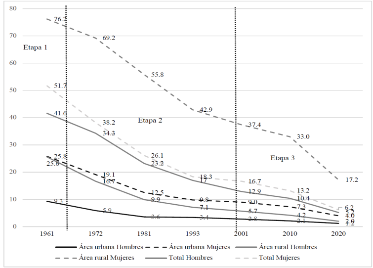 La transición demográfica impulsada principalmente por la reducción de la fecundidad y nuevos modelos reproductivos puede ser puesta en perspectiva con diferentes procesos que remiten a la modernización sociocultural que ha atravesado la sociedad peruana a lo largo de las últimas décadas. El primer factor clave se refiere al acceso a la educación y a la baja considerable del analfabetismo desde mediados del siglo XX. Según el censo de 1876, 79.7 por ciento de los hombres y 89.4 por ciento de las mujeres no sabían ni leer, ni escribir. En 1940, este fenómeno seguía afectando a 45 por ciento de los hombres y a 69.3 por ciento de las mujeres. Los datos disponibles a partir del censo de 1961 permiten describir la disminución del analfabetismo para ambos sexos en una perspectiva comparativa entre área urbanas y rurales. En lo que se ha delimitado como la primera etapa de la transición demográfica (antes del periodo 1965/70), el analfabetismo afectaba a 76.2 por ciento de las mujeres de zonas rurales, una proporción tres veces mayor a las mujeres de zonas urbanas (25.8 por ciento). En esa misma época, el analfabetismo afectaba 2.8 veces menos a los hombres que a las mujeres residentes en áreas urbanas (9.3 por ciento versus 25.8 por ciento), y 1.8 veces menos a los hombres que a las mujeres residentes en áreas rurales (41.6 por ciento versus 76.2 por ciento). A largo de la segunda etapa de la transición demográfica (1965/70 - 1995/2000), el analfabetismo se fue reduciendo de forma substantiva, en particular en las décadas 1970 y 1980. Entre 1961 y 2001, esta proporción disminuyó por década en promedio de 1.6 por ciento para los hombres de áreas urbanas, 4.2 por ciento para las mujeres de áreas urbanas, 7.2 por ciento para los hombres de áreas rurales y 9.7 por ciento para las mujeres de áreas rurales. A inicios del siglo XXI, 4.2 veces más de mujeres de zonas rurales estaban afectadas por el analfabetismo que la misma población en zonas urbanas (37.4 por ciento versus nueve por ciento). La diferencia alcanzaba el mismo cociente entre la población rural y urbana (25 por ciento versus seis por ciento). La reducción del analfabetismo se prolongó en la tercera etapa de la transición demográfica, en particular en los años 2010. En el año 2020, el fenómeno afectaba a dos por ciento de la población urbana y 11 por ciento de la población rural. Las mujeres de zonas rurales mantenían una proporción de analfabetismo muy superior al resto de la población total (17.2 por ciento versus 4.1 por ciento). Esta reducción del analfabetismo promovida por políticas educativas desde el sector público y Organizaciones no gubernamentales se inscribe en un proceso histórico de cambio profundo de la sociedad peruana que no elimina las brechas tanto entre los sexos como en los ámbitos de residencia (Figura 6).