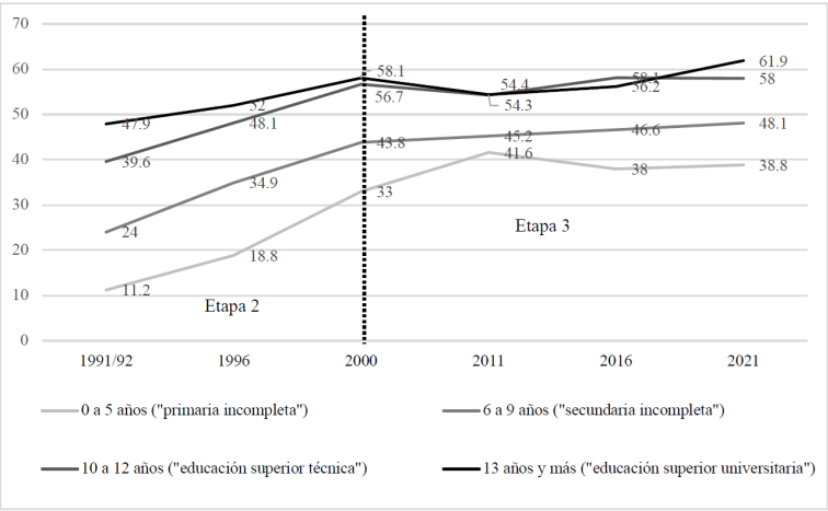 El número acumulado de años de instrucción por la población femenina mayor de 15 años y las desigualdades que revela este indicador es determinante en la observación de los diferentes niveles de uso de métodos anticonceptivos modernos de las mujeres en edad reproductiva. La siguiente figura evidencia la correlación entre el nivel de instrucción y el uso de una planificación familiar basada en métodos anticonceptivos modernos. Los datos disponibles proceden de las distintas ENDES realizadas entre 1991 y 2021. Desde inicios de los años 1990, las diferencias en el uso de métodos anticonceptivos modernos eran muy marcadas dentro de la población femenina en edad reproductiva en función del nivel escolar alcanzado. Solo 11.2 por ciento de las mujeres con menos de cinco años de instrucción usaba métodos anticonceptivos modernos, contra 47.9 por ciento de aquellas con más de 13 años de años de instrucción. Durante la década 1990, el uso de métodos anticonceptivos modernos aumentó para todos los grupos de mujeres, en particular para aquellas con cero a cinco años de instrucción (+21.8 por ciento) y aquellas con seis a nueve años de instrucción (+19.8 por ciento). La brecha dentro de la población femenina en edad reproductiva se fue reduciendo en la década 1990, manteniendo dos grupos diferenciados; aquellas con secundaria completa y acceso a los estudios superiores (con más de 50 por ciento de uso de métodos anticonceptivos modernos) y aquellas con primaria y/o secundaria incompleta (por debajo de 50 por ciento de métodos anticonceptivos modernos).