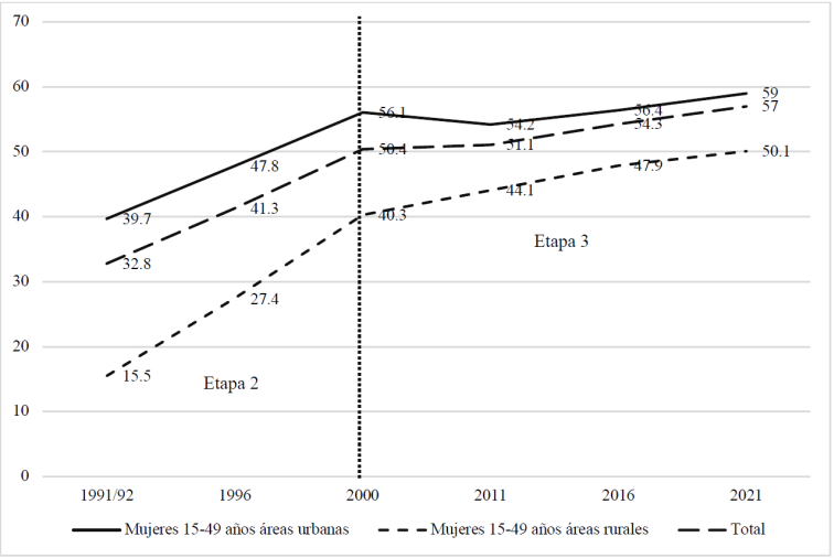Por último, con respecto a la planificación familiar basada en métodos anticonceptivos modernos entre ámbitos de residencia, las diferencias se fueron reduciendo considerablemente entre la segunda y tercera etapa de la transición demográfica. En 1991, más del doble de las mujeres unidas en edad reproductiva residentes en las zonas urbanas del país usaban métodos modernos (39.7 por ciento contra 15.5 por ciento para mujeres de zonas rurales). Ambas poblaciones femeninas aumentaron significativamente su uso de métodos anticonceptivos modernos durante la década 1990 y, en menor medida, entre 2000 y 2021. La brecha entre ambas áreas de residencia es actualmente menor a diez por ciento y evidencia cierta generalización en el uso de métodos modernos en el conjunto del país.