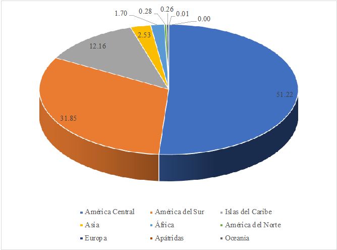 Diversos son los orígenes de la migración irregular que transita por el país en 2022. Se resalta la mayor presencia de personas provenientes de Centroamérica (51.2 por ciento), América del Sur (31.8 por ciento), las Islas del Caribe (12.2 por ciento), Asia (2.5 por ciento), África (1.7 por ciento), América del Norte, Europa y Oceanía (Figura 1).
