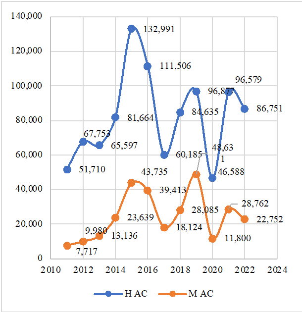 Para propósitos expositivos, se ha incluido el siguiente gráfico que muestra la migración irregular de mujeres provenientes de diversas regiones del mundo que han pasado por México entre 2011 y 2022. Se estima que el número acumulado de migrantes irregulares es de casi dos millones de personas procedentes de diferentes partes del mundo. De estos, 1,465,792 son hombres y 528,812 son mujeres, lo que representa 26.5 por ciento del total acumulado de 2011 a 2022.