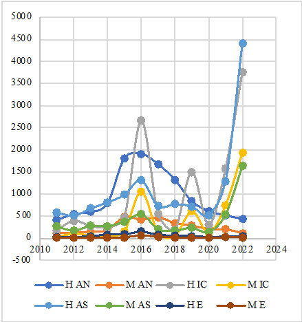 La migración irregular en México ha experimentado un incremento significativo en los últimos años. En 2019, se registraron 182,940 personas migrantes irregulares, mientras que en 2022 esta cifra se elevó a 444,439 personas. Esto representa un aumento absoluto de 261,499 migrantes irregulares en este periodo. Sin embargo, en 2020, debido a la pandemia del Covid-19, hubo una disminución en la migración irregular debido a las restricciones de movilidad impuestas. A pesar de esto, a partir de 2021 y 2022, después de la pandemia, se ha observado un incremento en la migración irregular, así como en su tasa de crecimiento promedio anual (Tabla 1). Este aumento se debe a la reanudación de la movilidad, la apertura de fronteras y los crecientes éxodos o caravanas de migrantes provenientes de diferentes partes del mundo, especialmente de países latinoamericanos.