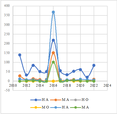 Un tercer grupo se refiere a los devueltos, hombres y mujeres, a los países de Asia (A), Oceanía (O) y África (A). Destacan las devoluciones de hombres y mujeres de estos grupos en el año 2016, según sus regiones de origen: Asia, Oceanía y África. Sin embargo, los provenientes de Asia son los más frecuentes, incluso durante la pandemia (Figura 9).