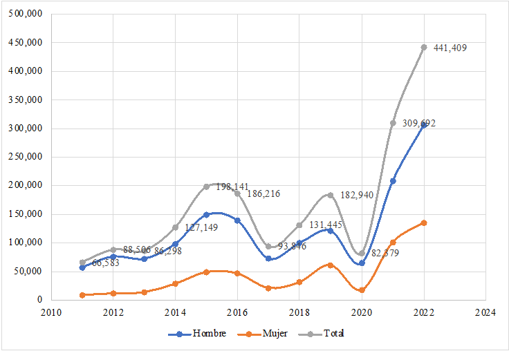 Su comportamiento entre 2011 y 2022 ha experimentado altibajos que se debió a la retórica del presidente Donald Trump en 2017 y a la pandemia del Covid-19 en 2020. Las caídas son más pronunciadas en el caso de las mujeres en comparación con los hombres y el total (Figura 2). Pero también se debe a la política de disuasión, retención y deportación aplicada en nuestro país durante los años mencionados.
