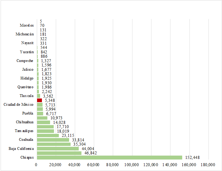 Los migrantes indocumentados se encuentran dispersos por todo el territorio nacional. Para el año 2022, se destacan las siguientes entidades federativas: Chiapas, con una población de 152,448 personas; Tabasco, con 46,842 personas; Baja California, con 44,004 personas; Veracruz, con 35,304 personas; Coahuila, con 33,814 personas; Sonora, con 23,115 personas; Tamaulipas, con 18,019 personas; Nuevo León, con 17,710 personas; Chihuahua, con 14,028 personas; Oaxaca, con 10,973 personas; Puebla, con 6,717 personas; San Luis Potosí, con 5,994 personas; Ciudad de México, con 5,713 personas; y el Estado de México, con 5,348 personas extranjeras en situación irregular (Figura 3).