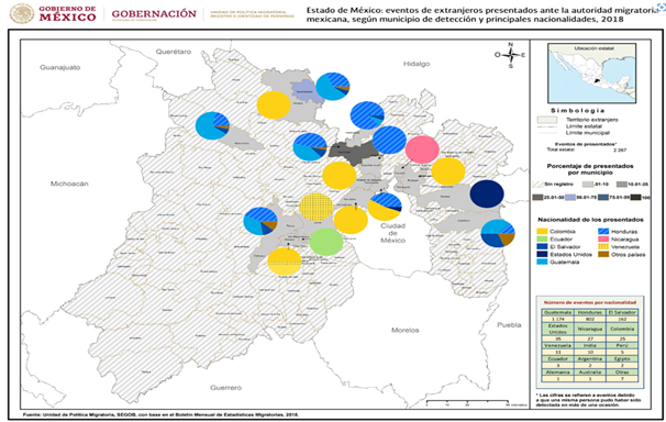 Tomando en consideración lo mencionado anteriormente y considerando la dificultad de medir la migración en flujo, se afirma que la presencia de migrantes irregulares en el país ha aumentado, especialmente en el Estado de México y sus municipios. Se destaca principalmente la presencia de centroamericanos, seguidos por aquellos que provienen de Suramérica y las Islas del Caribe. En menor medida, pero con una diversificación creciente, se encuentran aquellos que provienen de Europa, África y Asia. Según los datos presentados, se ha identificado alrededor de 170 países como origen de la migración irregular en México, de los cuales 30 han sido detectados en el Estado de México.