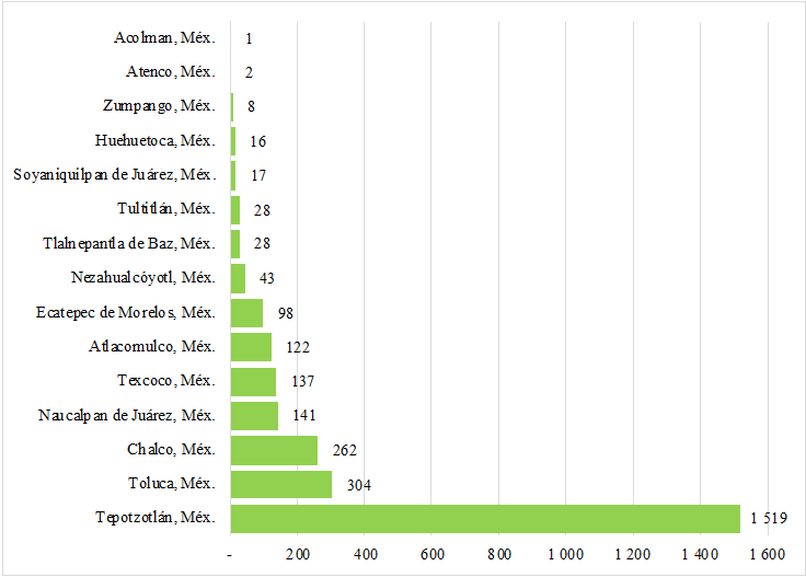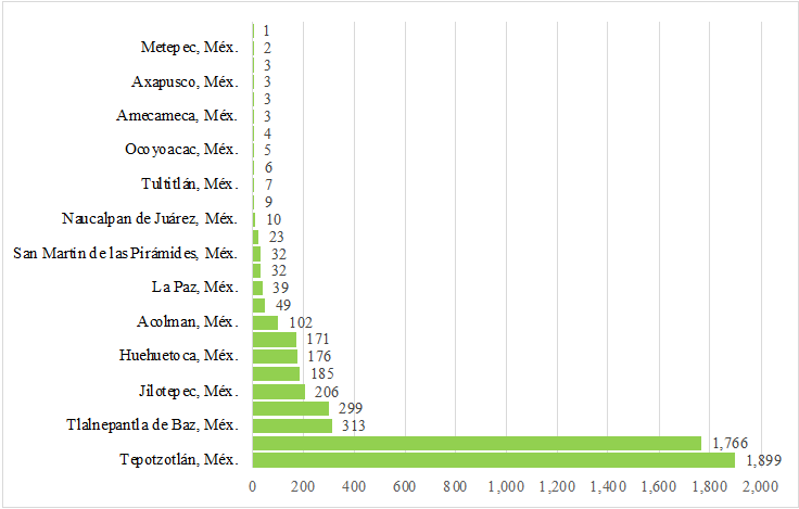 La información previa sugiere que la migración irregular en el Estado de México se ha distribuido en varios municipios, como Acolman, Amecameca, Apaxco, Atlacomulco, Axapusco, Chalco, Cuautitlán Izcalli, Cuautitlán, Ecatepec de Morelos, Huehuetoca, Ixtapaluca, Jilotepec, La Paz, Metepec, Naucalpan de Juárez, Nezahualcóyotl, Ocoyoacac, San Martín de las Pirámides, Soyaniquilpan de Juárez, Tepotzotlán, Texcoco, Tianguistenco, Tlalmanalco, Tlalnepantla de Baz, Toluca y Tultitlán durante el año 2022. Cabe resaltar que cada vez más municipios de la entidad son testigos de este fenómeno migratorio internacional, siendo Tepotzotlán, Chalco y Toluca los que ocupan los primeros lugares en el número de casos (Figuras 4 y 5).